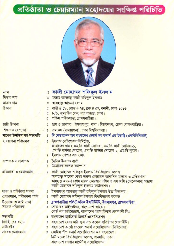 কাজী মোহাম্মদ শফিকুল ইসলাম একজন দূরদর্শী শিক্ষানুরাগী ও সমাজসেবক। শিক্ষা বিস্তারে তাঁর অগ্রণী ভূমিকার ফলেই এই মহাবিদ্যালয়ের শুভ সূচনা হয়। তিনি ছিলেন প্রতিষ্ঠাতা সভাপতি এবং মহাবিদ্যালয়ের স্থপতি।